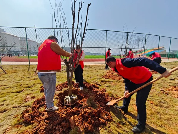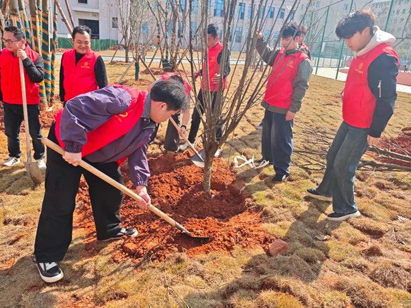 此次活动中,全体参与人员同心协力,共栽种紫玉兰、红叶李、紫薇等苗木三十余株,为初春校园增添新绿。活动不仅切实改善了校园生态环境,更以实践育人为抓手,将生态教育、劳动教育与思政教育深度融合,让师生在躬身实践中凝聚生态共识、厚植责任担当,进一步强化了环保意识和校园主人翁精神。