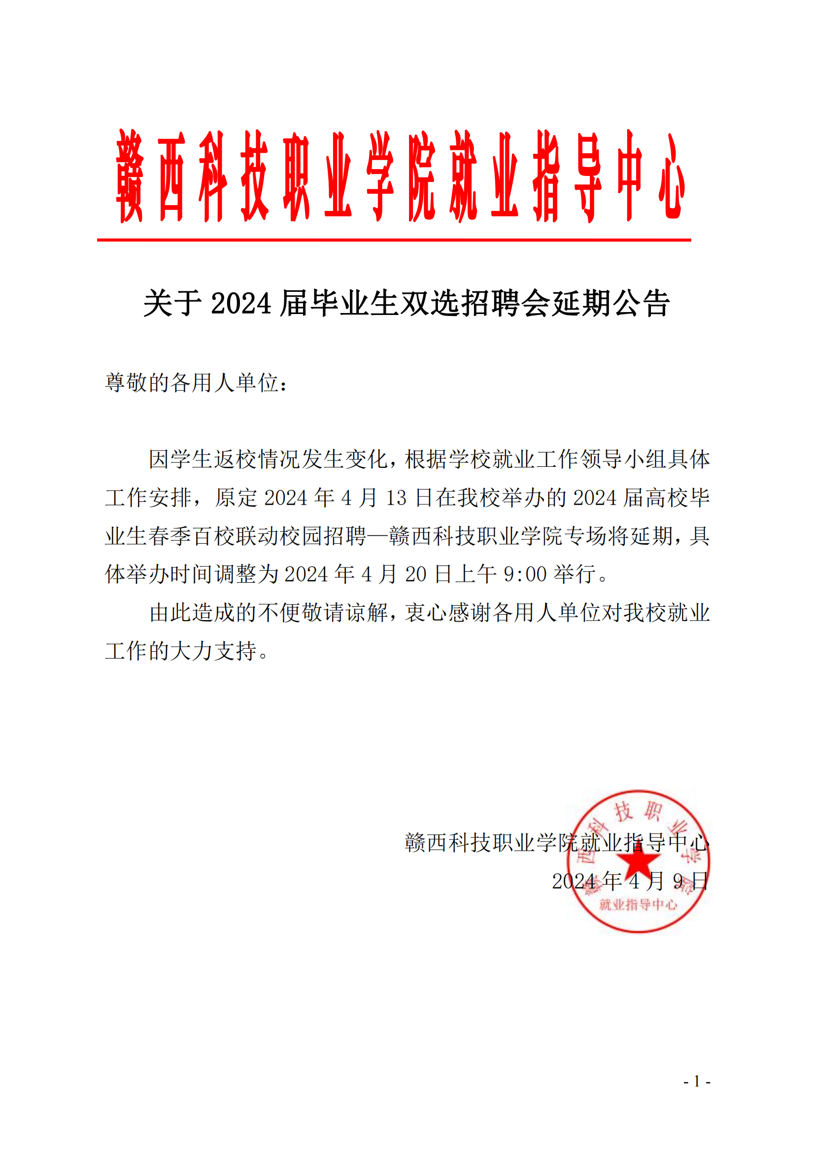赣西科技职业学院关于2024届毕业生双选招聘会延期公告