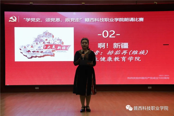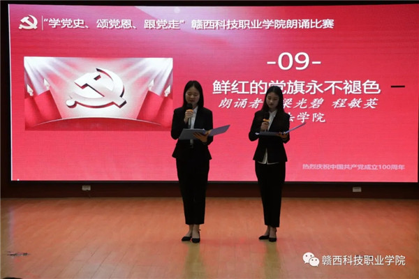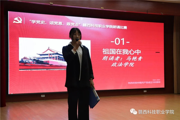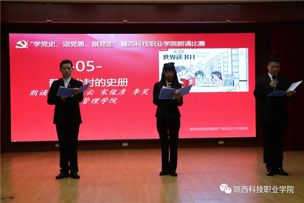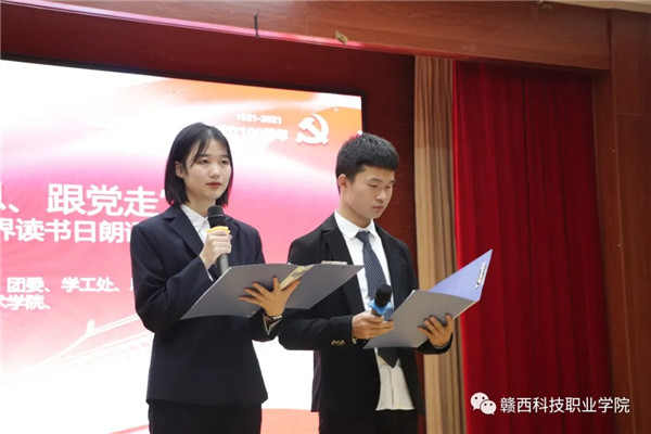 4月28日晚上,我校在学术报告厅举行“诵读红色经典 献礼建党 100 周年——世界读书日”朗诵比赛活动。活动现场,10组参赛选手个个慷慨激昂,《我爱你 中国共产党》、《翻开尘封的史册》、《党的赞歌》等神采飞扬、振奋人心的朗诵,赢得了一阵阵热烈掌声,所有参赛作品紧紧围绕“学党史、颂党恩、跟党走”教育主题,带领大家一起重温了中国共产党100年的历史沧桑和波澜壮阔的奋进征程,抒发着对党、对祖国的无限热爱与忠诚,彰显了跟党走的坚定信仰。