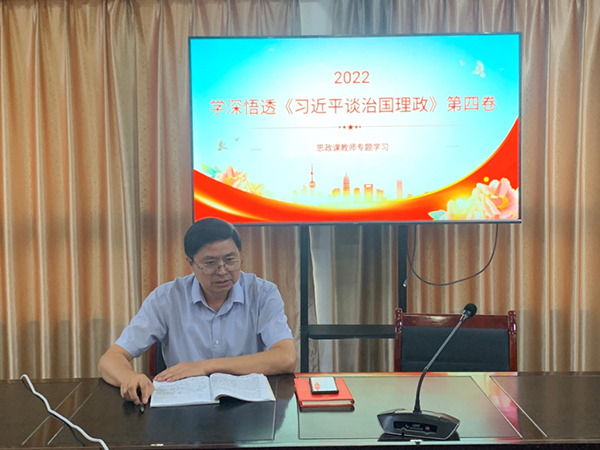 思政课教师黄财宝就《习近平谈治国理政》第四卷中的第十三个部分的第三篇文章——“在加快推进教育现代化的新征程中培养担当民族复兴大任的时代新人”为主要学习内容同在座所有教师进行学习心得分享,黄财宝老师提出几点与老师们共勉:一要明确教育目标,提高政治素养。要更加自觉地用习近平新时代中国特色社会主义思想武装头脑,指导日常的工作教学。二要加强新知识学习,提升教学水平。我们老师应成为源源不断的活水,这样才能给学生注入新的活力和能量。三要加强品德修养,增强责任感和使命感,潜心教学,在朝着第二个百年奋斗目标的新征程中,培养担当民族复兴大任的时代新人。