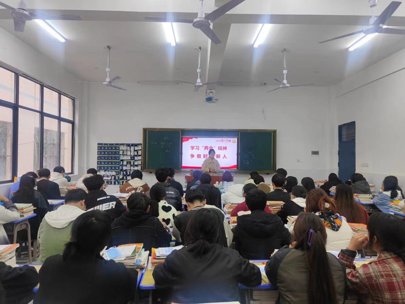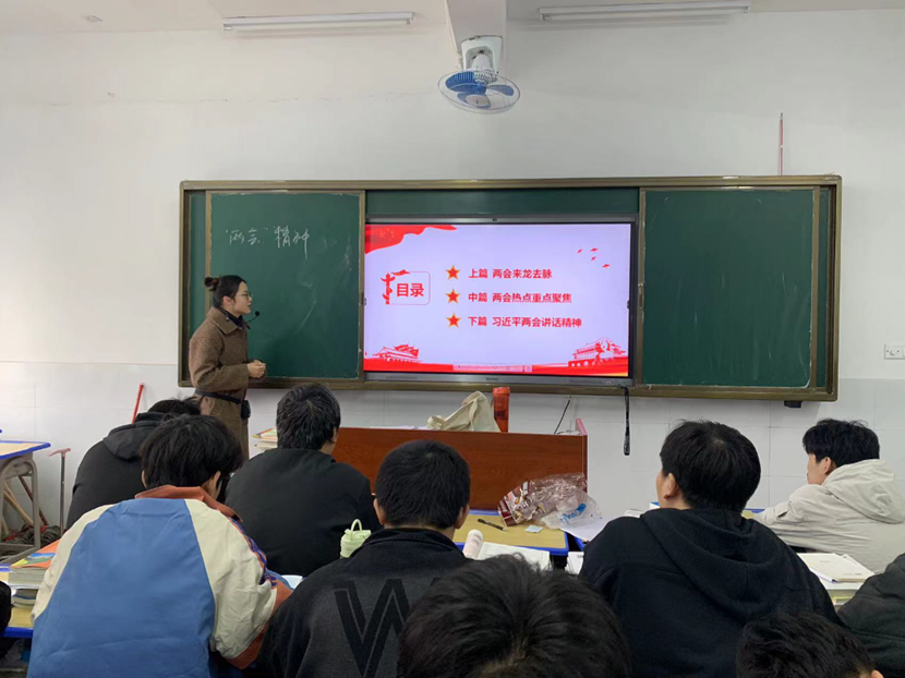 为深入学习贯彻2023年全国两会精神,推进两会精神融入课堂教学,切实提升思政课的思想性和理论性,近日,赣西科技职业学院思政部“形势与政策”课程教研组教师化身为宣讲员走进班级,把全国两会知识搬进课堂,为同学们系统解读全国两会精神,引导同学们关心国家大事,激发爱国热情。