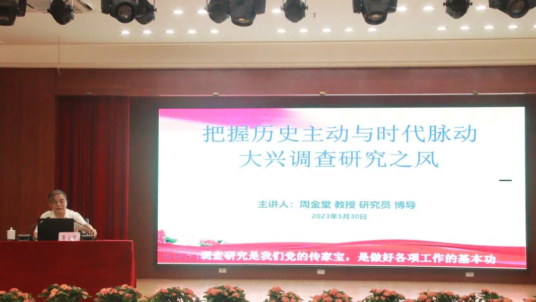 周金堂从“全面深刻把握调查研究的内涵与特质”“毛泽东关于做好调查研究的重要论述”“习近平关于做好调查研究的重要论述”“调查研究的主要功用及主要方式方法”“大兴调查研究之风,高质量推动新时代新发展”五个方面作了全面深入的辅导。