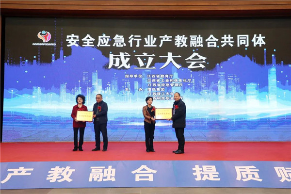 为深入学习贯彻党的二十大精神,落实中共中央办公厅、国务院办公厅《关于深化现代职业教育体系建设改革的意见》、教育部办公厅《关于加快推进现代职业教育体系建设改革重点任务的通知》和江西省“1269” 行动计划(2023-2026),12月5日上午,在江西省教育厅、江西省工业和信息化厅、江西省应急管理厅等有关部门指导下,由博迅集团、江西理工大学、赣西科技职业学院联合发起成立的安全应急行业产教融合共同体大会在新余市会展中心多功能厅隆重召开。江西省应急管理厅副厅长徐何明、新余市人民政府副市长陈文华、江西省工业和信息化厅装备工业处处长罗冰、博迅集团董事长李忻农、江西理工大学副校长唐云志、赣西科技职业学院董事长詹慧珍、新余市教育局副局长钟淑平、新余市应急管理局副局长袁丁、新余市工业和信息化局副局长吴晶晶、赣西科技职业学院党委书记张国斌、赣西科技职业学院校长孔华等领导出席大会。江西建工土木工程有限责任公司、江西新余国科科技股份有限公司、江西剑安消防科技有限责任公司等100余家企业代表和南昌大学、华东交通大学、新余学院等50余所高等院校、科研院所代表参加大会。