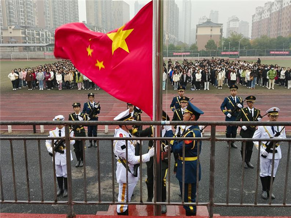 2023年12月4日上午,在我校师生的注目下,伴随着国旗仪仗队护旗方阵铿锵有力的步伐和《义勇军进行曲》雄壮的旋律,五星红旗冉冉升起,迎风飘扬,在场全体人员向国旗行注目礼,表达对祖国无限的热爱和崇高的敬意。