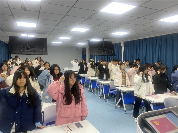 全班同学一起重温入团誓词,在庄严的氛围中,同学们郑重举起右拳,以铮铮誓言和昂扬的精神面貌,立志以青年之力为共产主义事业而奋斗。